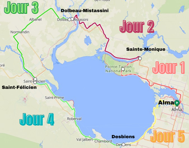 Entamez votre dernière journée en longeant les rives de Métabetchouan. La bonne nouvelle, c'est que vous serez en descente, alors profitez de la poussée que vous offre la gravité pour vous détendre et apprécier les paysages, ainsi que la température si elle est clémente. Faites autant d'arrêts que nécessaire pour savourer les bons moments et profiter des plages afin de vous y rafraîchir. Faites un arrêt dégustation à la microbrasserie du Lac-Saint-Jean et à la fromagerie-boulangerie Médard, à Saint-Gédéon. Pour conclure le tour du lac, retournez à votre point de départ : notre agence à Alma.